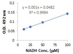 maximum at 492 nm (detection limit ~5 uM). Note that the sample NADH concentration, which is overestimated in the assay, should be used as